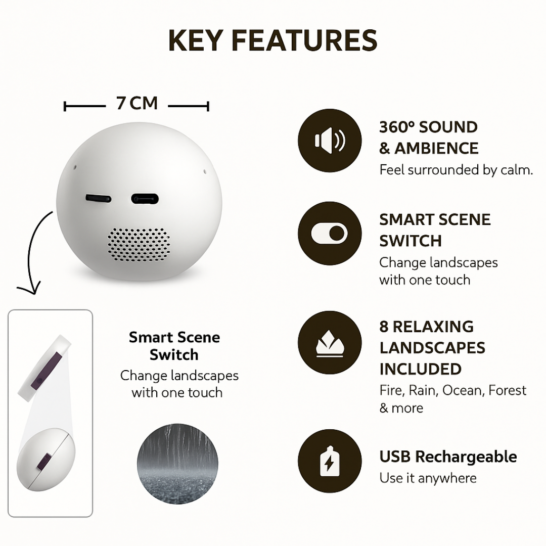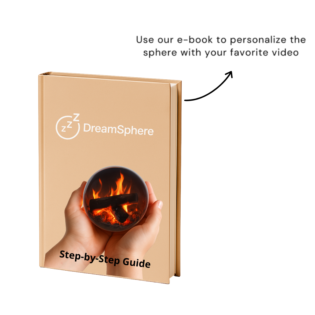 DreamSphere™ features calming soundscapes such as a gentle campfire, soothing birdsong, flowing river, ocean waves, soft rain, deep storm ambience, snowy wind, and relaxing frequency waves—designed to help quiet the mind and promote deep sleep.